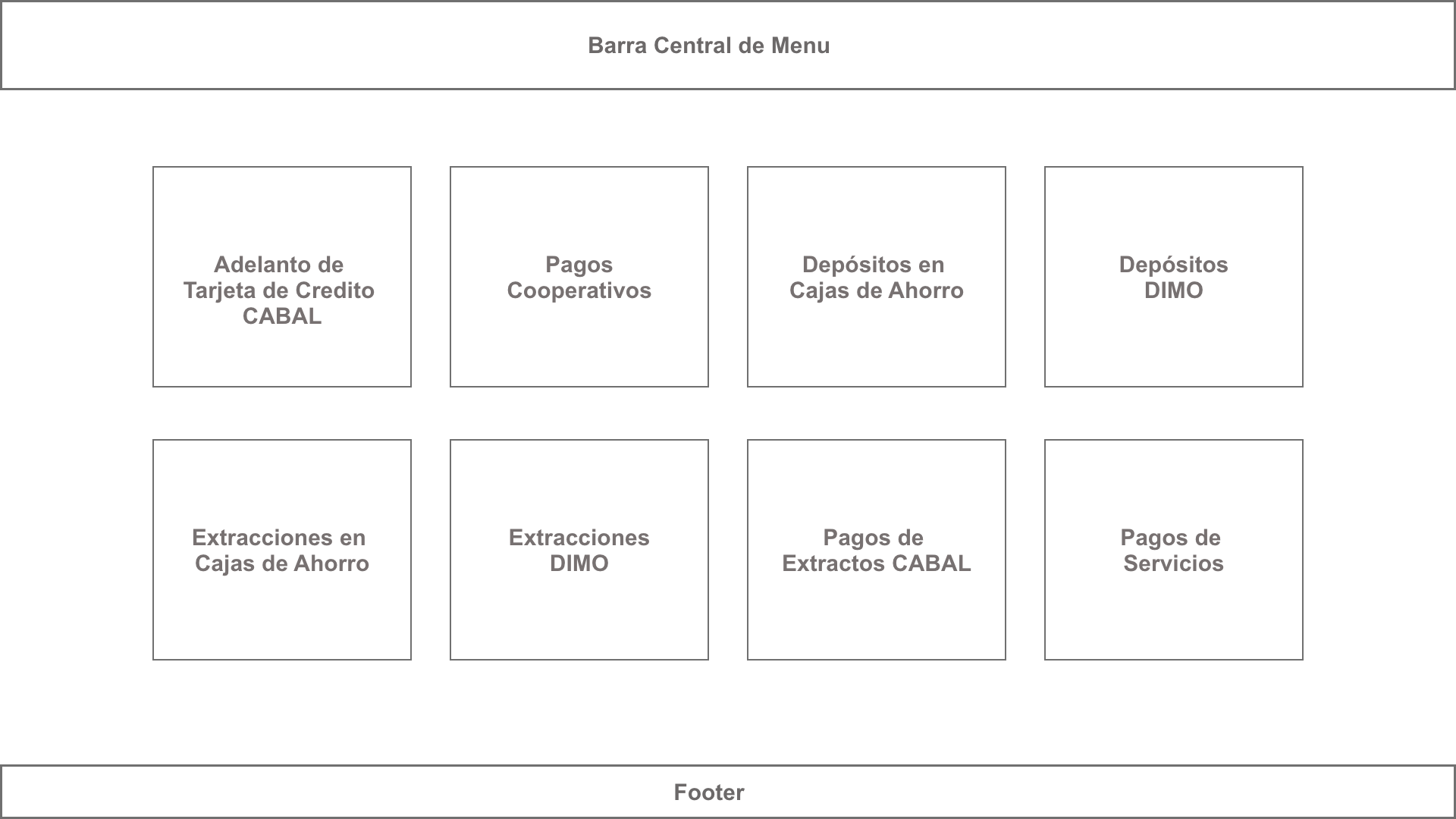 | 8 | Pagos de Tarjetas de Crédito CABAL | Pantalla para que el cajero pueda seleccionar la TC y el monto para realizar el pago. | Alta |